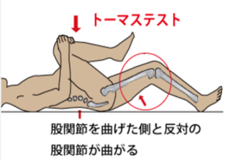 正常な股関節は約135°ほど屈曲します。この屈曲動作に制限があると上の図のように骨盤が前傾する事で代償(正常な位置に戻そうとする)する事があります。この股関節屈曲拘縮の原因として様々な疾患が関与します。例えば脳卒中や大腿骨頸部骨折、変形性股関節症などです。また、股関節を曲げる腸腰筋、大腿直筋、縫工筋などの筋損傷により痛みを和らげようとして股関節が曲がったままになる事があります。※Thomas test:股関節の屈曲拘縮があるかないかを見分ける。