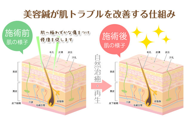 禅整骨院の美容鍼灸は、髪の毛よりも細い鍼(針)を使用して経穴(ツボ)を刺激することにより、皮膚や筋肉の代謝や血流を促す施術です。筋肉のこりを除去し、顔および美容のトラブルや不調を改善していきます。また、眠っていた細胞は美容鍼灸の刺激によって活発に活動を始めます。活性化した細胞は血流も整い、肌や筋肉に良い作用をもたらす物質(コラーゲンやセラミドなど)の分泌を促します。同時に皮膚のターンオーバー(新陳代謝)も促します。