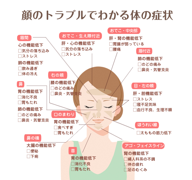 | 眉間 | 心の機能低下 (気分の落ち込み/ストレス)、肺の機能低下 (飲み過ぎ/体の冷え) |